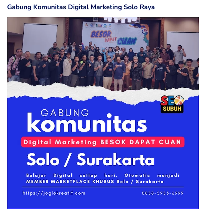 Apakah Anda ingin mempercepat pertumbuhan bisnis atau karir di dunia digital marketing? Kami mengundang Anda untuk bergabung dalam Komunitas Digital Marketing Solo. Hanya dengan Rp 50.000, Anda akan mendapatkan akses eksklusif ke berbagai materi, pelatihan, dan networking yang bisa mengubah perjalanan digital marketing Anda!